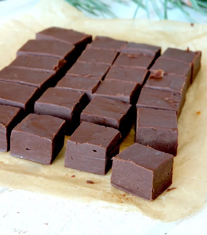 2. Bred ut smeten i en form, 24 x 32 cm, klädd med bakplåtspapper (eller i två mindre formar, ca 12 x 16 cm). Låt den stelna i kylen. Skär fudgen i bitar när den stelnat.