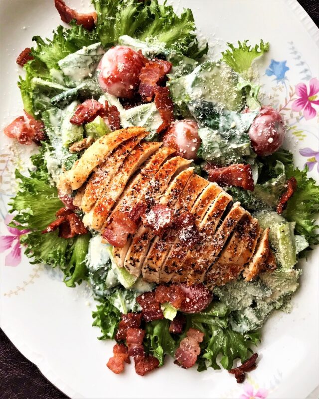 Vegetariskt alternativ: Välj kapris istället för sardeller i caesardressingen, och stek quorn istället för kyckling och vegetariskt bacon. Njut!