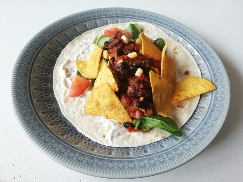 3. Låt sjuda i 5 min under lock på medelvärme, rör om då och då. Servera med nachochips eller tortillabröd och toppa chilin med persilja och/eller koriander.