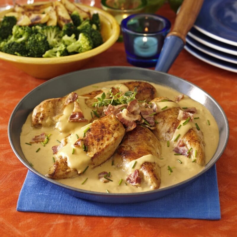3. Tärna och knaperstek baconet i en stekpanna. Strö bacon och gräslök över kycklingen.