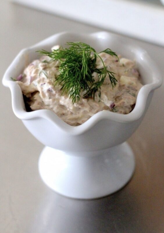 2. Häll av tonfisken och blanda med créme fraiche, lök och tomat i en bunke.