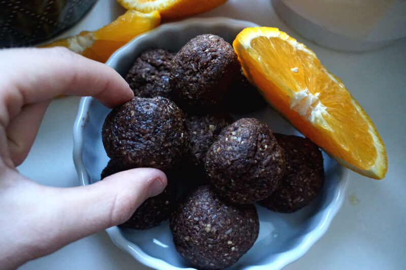 Mixa dadlar, havregryn, kakao och kokos till en grynig massa. Riv i apelsinskal och pressa…