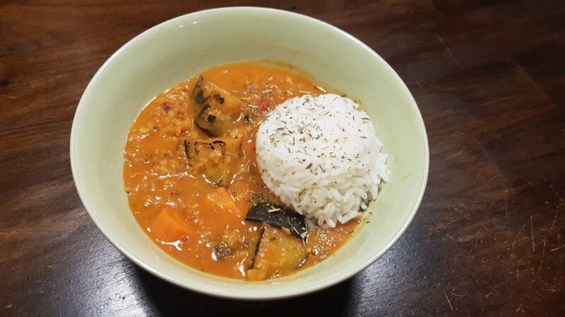 1. Koka riset enligt anvisningen på förpackningen. 2. Stek aubergine, morot och lök i olja…
