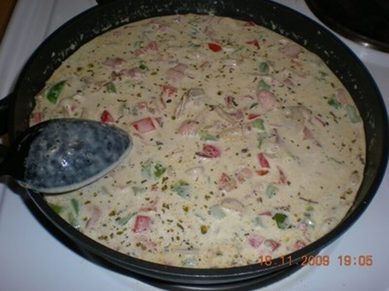 1. Strimla baconen. 2. Skär paprikan i tärningar. 3. Skär champinjonerna i skivor. 4. Stek…