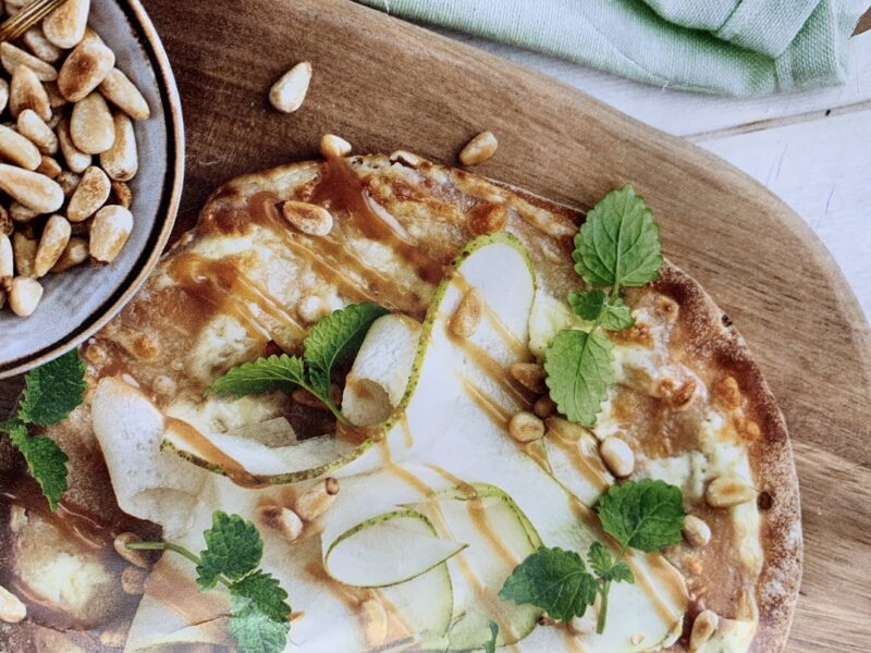 1. Sätt ugnen på 225 2. Rosta pinjenötter i en torr stekpanna. 3. Lägg pizzabottnar…