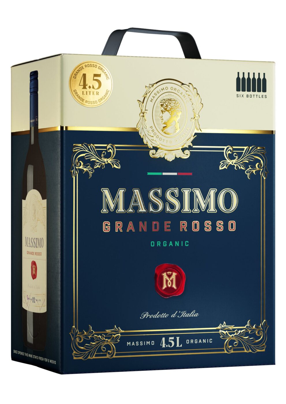 Massimo Grande Rosso är ett ekologiskt rött vin från Italien på 4,5liter. Ett storslaget vin från älskade Italien som kommer i en lika storslagen förpackning. Vinet har en rund, intensiv smak med lena tanniner och inslag av plommon, körsbär och choklad.