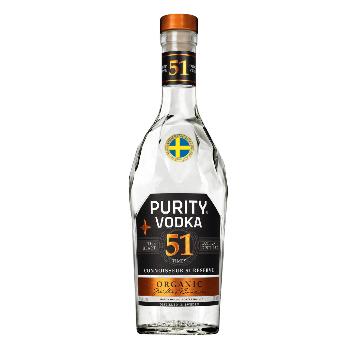 Purity Connoisseur 51 Reserve är en ekologisk ultra-premiumvodka från Purity Distillery i Eslövs, Skåne. Under ledning av Master Distiller Stefan Magnusson och Master Blender Mathias Tönnesson destilleras vodkan hela 51 gånger med koppar-ytedestillation under mer än 20 timmar – en noggrann och hantverksmässig process som går långt bortom industriella standarder.